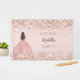 Un libro de visitas para una fiesta femenina y glamorosa de dulces 16, 16 años. Un elegante fondo dorado rosa con confeti y un chica vestido de princesa, bata de bolas. Personalice y agregue su nombre, edad/fecha. El nombre está escrito con un guión de estilo con letras a mano Spine: agrega tu propio texto.