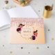 Un libro de invitados para una dulce fiesta de 16 y 16 años. Un fondo de degradado dorado y rosa ruidoso de moda con un marco geométrico falso dorado. Decorado con flores moradas oscuras y borgoñonas, rosas y plumas de estilo boho. Rosa purpurina de imitación de oro gotea, pinta goteo en la parte delantera y trasera. Plantillas para un nombre, fecha y edad. El nombre se escribe con un guión de estilo con letras a mano. Texto negro. Añade tu texto en la columna vertebral.