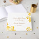 Dorada y elegante abeja con tema de abeja miel libro de invitados de ducha de bebé con un fondo blanco crujiente. El diseño presenta un bonito diseño de peine de miel abstracto de color amarillo acuático, con bonitas abejas de miel estilizadas incorporadas a los elementos del peine de miel. El libro de invitados presenta el tipo "Sweet Little Honey is the way", con un estilo de letra hermoso de escritura. En el reverso del libro de visitas para bebés con abejas melíferas se encuentra el peine de miel diseñado en forma de flor. El monograma inicial se coloca en el centro, con una linda abeja. Todos los ilustraciones contenidos en nuestro libro de visitas para bebés con abejas melíferas son obras de arte originales hechas a mano por Moodthology.