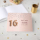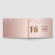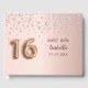 Un libro de visitas para una fiesta de cumpleaños 16, 16, glamurosa y glamurosa. Un falso fondo de oro rosa con diamantes de imitación rosa. Personalice y agregue un nombre y una fecha. El nombre está escrito en oro rosa oscuro con una escritura de estilo moderno con letras a mano. El número 16 se escribe con un tipo de letra de estilo globo.