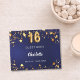 Atractivo fondo azul marino, desigual y con estrellas de oro falsas. Agrega tu nombre y texto. El número de edad se escribe con un tipo de letra de estilo globo. Espina: agrega tu texto.