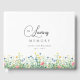 Minimalista, encantadora flor silvestre "In Loving Memory" celebración de la vida, libro de invitados funerarios, elegante, encantadora letra de escritura a mano, blanco, gris, colores pastel.
