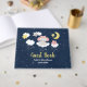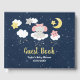 Este lindo y caprichoso libro de invitados presenta un adorable elefante bebé en una proa rosa sentado en una nube con estrellas en caída. En el fondo hay un cielo estrellado por la noche y una luna creciente. El texto combina guiones manuscritos y sans serif para un estilo elegante y moderno. Es perfecto para una ducha de bebé.