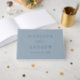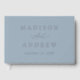 Este elegante libro de bodas es perfecto para bodas modernos y elegantes. El libro de huéspedes incluye sus nombres y fecha de boda en letras de Relieve metalizado plateado con un polvoriento fondo azul. Añada el texto de su personalizado a la columna vertebral del libro de visitas minimalista del boda. En la parte posterior del libro de visitas al Relieve metalizado se muestra su foto de compromiso horizontal.