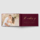 Este elegante libro de bodas es perfecto para bodas modernos y elegantes. El diseño presenta "el boda de" mostrado en caligrafía de Relieve metalizado dorado con sus nombres y fecha de boda mostrada abajo en un fondo borgoñoso. Añada el texto de su personalizado a la columna vertebral del libro de visitas minimalista del boda. En la parte posterior del libro de visitas al Relieve metalizado se muestra su foto de compromiso horizontal.