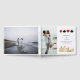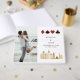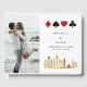Moderno y elegante libro de firmas para boda de destino en Las Vegas. El diseño presenta el horizonte de la ciudad de Las Vegas en oro, iconos de tréboles, diamantes, corazones y picas en marco elegante dorado, 2 fotos y detalles en letra de moda en la parte frontal.