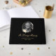 Elegante libro de invitados para conmemoraciones/fúnebres de flores negras con rosas de acuarela amarilla y flores del aliento del bebé adornando un marco de foto de oro con un fondo negro. Personaliza fácilmente en línea.