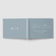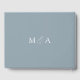 Elegante libro de bodas con "Guest Book" presentado en un guión moderno de caligrafía blanca sobre un polvoriento fondo azul. Personalice la parte delantera del sencillo libro de bodas con sus nombres y fecha de boda. En la parte posterior del polvoriento libro de visitas azul se muestran las iniciales del monograma. Añade tu nombre de matrimonio y fecha de boda a la columna vertebral del libro de invitados.