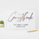 Este sencillo diseño presenta un elegante y moderno tipo de letra para la escritura a mano que se utiliza para crear una imagen que dice "Guestbook". El gráfico fue embellecido con un acabado de oro rosa de imitación metálica. Utilice los campos de plantilla para agregar sus datos personales. El fondo puede cambiarse a cualquier color que prefiera. // 151 //