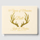 Celebre su 50 aniversario especial con este hermoso libro de invitados que presenta cuernos de ciervo dorados falsos y un suave fondo crema.
