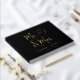 Elegante libro de bodas negros con "Mr & Mrs." en un gran guión, un ilustracion de dos corazones juntos, y sus nombres y fecha boda, todo rendido en su elección de oro real, plata o Relieve metalizado de oro rosa. Personaliza tu título en la columna vertebral y agrega tu foto de compromiso favorita en la parte posterior.