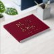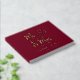 Elegante libro de boda rojo burdeos que incluye "Mr & Mrs." en un gran guión, un ilustracion de dos corazones románticamente unidos, y sus nombres y fecha boda, todo representado en su elección de Relieve metalizado de oro, plata o oro rosa. Puedes personalizar tu título en la columna vertebral y añadir tu foto de compromiso favorita en la parte posterior.