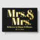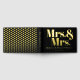 Este elegante libro de bodas lesbianas muestra un diseño con acentos de Relieve metalizado dorado, destacando los títulos "Sra. y Sra." en tipografía audaz. También incluye una ampersand y un círculo con un corazón de amor dorado en lugar de un símbolo de época. El fondo es negro. La parte trasera incluye un patrón hecho de corazones de Relieve metalizado de oro.