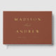 Este elegante libro de bodas es perfecto para bodas modernos y elegantes. El libro de oro incluye sus nombres y fecha de boda con letras de Relieve metalizado dorado con un fondo de color marrón terracota. Añada el texto de su personalizado a la columna vertebral del libro de visitas minimalista del boda. En la parte posterior del libro de visitas al Relieve metalizado se muestra su foto de compromiso horizontal.