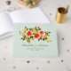 Elegante y moderno diseño de libro de bodas con rosas de acuarela roja, follaje verde sobre un fondo de menta.