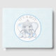 Libro de invitados sobre la ducha de bebé de elefantes con adorable elefante de bebé con un pacificador sobre un fondo de bebé azul y blanco. Este lindo libro de bienvenida de duchas para bebés de elefantes se personaliza fácilmente con el texto de tu elección.