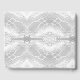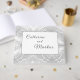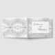El diseño presenta un fondo blanco de satinado falso para el monograma de la pareja recién casada. Center muestra el nombre inicial del apellido en un tipo de letra grande, elegante y plateado. La primera inicial de novia y novio se muestra en ambos lados en el mismo tipo de letra, pero más pequeña. Las palabras "GRACIAS" aparecen a continuación. El interior se deja en blanco.