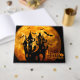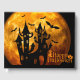Este diseño presenta un feliz saludo de Halloween con una imagen de luna llena iluminada en un espeluznante tono de naranja brillante. También se puede ver una casa embrujada y murciélagos volando en el aire. Junto al texto hay dos pequeñas imágenes: una de un gato y otra de una calabaza, ambas asociadas con Halloween.