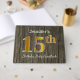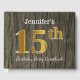 El diseño de este libro de huéspedes incluye el número ordinal "15" con un aspecto de oro falso. También cuenta con un nombre personalizado y un ambiente rústico de madera falsa. Se podría usar en un fiesta para alguien que celebre su 15º cumpleaños. [~Z0000053]