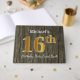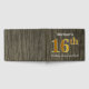 El diseño de este libro de huéspedes incluye el número ordinal "16º" con un aspecto falso dorado. También tiene un nombre personalizado y un estilo rústico de madera falsa. Se podría usar en un fiesta para alguien que celebre su decimosexto cumpleaños. [~Z0000053]