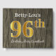 El diseño de este libro de huéspedes incluye el número ordinal "96" con un aspecto de imitación de oro. También cuenta con un nombre personalizado y un decorado rústico de madera falsa. Se podría usar en un fiesta para alguien que celebre su cumpleaños número noventa y seis. [~Z0000053]