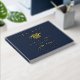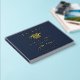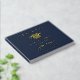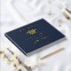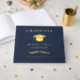 Libro de invitados de fiesta de graduación azul oscuro elegante con lámina de oro real con gorra de graduado, "Graduado" y el nombre del graduado, escuela y año de clase en tipografía serif clásica. Personalice el texto adicional en la columna vertebral y la parte posterior.