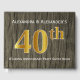 El diseño de este libro de huéspedes incluye el número ordinal "40" con un aspecto de oro falso. También cuenta con nombres a medida y un decorado rústico de madera falsa. Se podría usar en un fiesta para una pareja casada que celebra su cuadragésimo aniversario de boda.