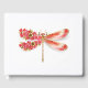 Dibujado artísticamente, dorado, libélula con joyas de color rojo y alas decoradas con rojo, floreciente, cerezo japonés con joyas sobre fondo blanco. Dragonfly de oro.