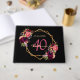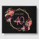Un libro de invitados para un fiesta de 40 años. Un fondo negro de moda con un marco geométrico falso dorado. Decorado con flores moradas oscuras y borgoñonas, rosas y plumas de estilo boho. Plantillas para un nombre, edad 40 y fecha. Fecha de nacimiento o fecha del fiesta. El nombre está escrito con un guión de estilo con letras a mano, letras de color rosa, edad en morado y fecha con números dorados. Texto en la columna vertebral.
