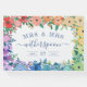 Boda floral arcoiris para un boda lesbiana con MRS y MRS escrito en una letra esbozada sobre tu nuevo apellido compartido en un guión de bonito. El marco floral se compone de flores en los colores del arcoiris.