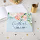 Este romántico libro de bodas azul claro es perfecto para una boda elegante. El diseño floral incluye flores de color rosa, melocotón y acuarela blanca en cascada sobre un fondo azul claro. Personalice la portada con los nombres de la novia y del novio y la fecha del boda.