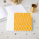 Sienta el océano en este audaz y moderno diseño de verano, con brillantes y solapadas ovejas de vieiras que se repiten en olas amarillas de bonito delineadas en blanco. Una franja de borde vertical blanca de verano con desplazamiento izquierdo termina la composición.