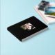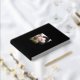 Un libro de invitados para un funeral o funeral. Un fondo negro clásico, un marco dorado en la parte delantera. Personalice y agregue una foto, nombre y fechas. Relieve metalizado dorado.