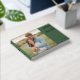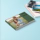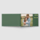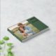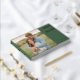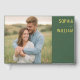 Esta cubierta para libro de invitados de boda presenta un diseño dividido con una cálida y romántica fotografía de dos personas abrazándose en un entorno al aire libre a la izquierda, rodeada de hierba alta y tonos naturales suaves. El lado derecho muestra un fondo verde oscuro sólido con tipografía elegante y moderna en dorado-amarillo para nombres y detalles personalizables. La disposición es equilibrada, creando un encanto contemporáneo pero rústico que transmite calidez e intimidad, perfecto para celebrar el amor y los momentos especiales.