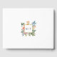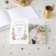 Bonito borde de arco dorado con elegantes rollos adornados con romántica moda boho acuarela color pastel flores silvestres en azul pálido, rosa y amarillo. Incluye campos de texto, plantilla de foto y monograma en la parte posterior. Esta encantadora colección es el complemento perfecto para su boda de primavera, verano o jardín.