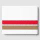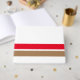 Este diseño deportivo, formal, presenta audaces rayas de carreras de borde inferior rojo brillante y mocha marrón claro contra un fondo blanco crujiente.