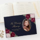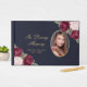 Personaliza fácilmente esta hermosa floral azul y dorada en el encantador libro de invitados de memoria/funeral con una foto adornada con rosas rojas y rosas rosadas borgoñas y flores del aliento del bebé en un fondo azul oscuro.