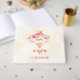 Globo de aire caliente en rosa, oro, amarillo y frambuesa con y rosas. Un lugar en el banner que personalizar con un nombre o frase. Sobre un fondo de acuarela dorado.