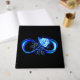Luminous infinity symbol with glowing, beautiful, lushly blooming rose made of blue flames on black background.