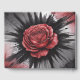 A symmetrical floral design featuring four large red roses arranged in a square pattern against a dark black background. Each rose is detailed with multiple layers of petals, creating a deep crimson color with subtle gradients. The roses are positioned at the top and bottom corners of the frame, with each rose having its own set of green leaves and stems. The leaves are detailed with visible veins and a lighter green color. The roses cast subtle shadows on the black background, creating depth. The black background has a textured, slightly mottled appearance, giving it a rich, deep quality. The overall composition creates a balanced, decorative frame with the roses evenly distributed across the top and bottom of the image. The artwork has a vintage or classic illustration style with clean lines and detailed botanical elements.