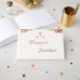 El diseño frontal presenta la elegante imagen de rosas en cascada en la parte superior. Una cruz se muestra en el centro de dos corazones. A continuación se presentan los nombres de los novios. Todos los textos e imágenes aparecen en un Relieve metalizado elegante. El cliente tiene la opción de Relieve metalizado oro, plata o oro rosa. Revertir muestra un mensaje personal o salmo. El texto se muestra en la columna vertebral con el mismo tipo de letra elegante. Todo el texto es personalizable. El delicado color de fondo, llamado "Nieve", encarna la pureza y la frescura con su suave pero cálido matiz. Diseñado para coordinar con la suite Boda Grace católica.