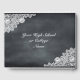 Elegante libro de visitas para la celebración de la graduación. Fondo de pizarra negra y decoración de encaje blanco. Hay más artículos disponibles en este estilo en nuestra tienda. Puede editar el diseño más adelante, cambiar el color de fondo, las fuentes y añadir texto adicional haciendo clic en el vínculo "Personalizar esta plantilla" y, a continuación, en el vínculo "Hacer clic en el personalizar más adelante".