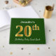 El diseño de este libro de huéspedes incluye el número ordinal "20" con un aspecto de oro falso. También cuenta con un nombre personalizado y un fondo de color verde. Se podría usar en un fiesta para alguien que celebre su vigésimo cumpleaños. [~Z0000056]