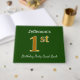 El diseño de este libro de huéspedes incluye el número ordinal "1st" con un aspecto falso dorado. También cuenta con un nombre personalizado y un fondo de color verde. Se podría usar en un fiesta para alguien que celebra su primer cumpleaños. [~Z0000056]
