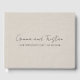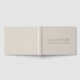 Un libro de invitados de boda minimalista moderno con tipografía de estilo manuscrita sobre un fondo gris plata de falso lino.