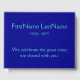 Este sencillo libro de visitas al funeral o al servicio conmemorativo incluye el mensaje "Celebramos los grandes momentos que compartimos con ustedes", y el nombre personalizado y las fechas de nacimiento y muerte del individuo que ha fallecido. El texto es de color turquesa y el fondo es azul oscuro. Se podría usar para registrar deseos solidarios para los parientes y amigos de alguien que ha fallecido recientemente.