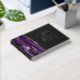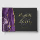 Este elegante libro de bodas presenta un diseño de ágata color morado adornado con un falso purpurina de oro. Personalizar fácilmente el texto real del Relieve metalizado de oro en un fondo fuera de negro, con los nombres de la pareja en una caligrafía de escritura a mano caprichosa sobre una gran ampersand gris. Añade texto adicional de su elección al frente y a la columna vertebral.