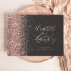 Este elegante libro de invitados para bodas presenta un rosa de purpurina de imitación de oro sobre un fondo negro. Personalizar fácilmente el texto real de Relieve metalizado de oro rosa, con los nombres de la pareja en caligrafía de escritura a mano caprichosa sobre una gran variedad gris. Añade texto adicional de su elección al frente y a la columna vertebral.