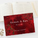 Libro de firmas de invitados encantador que tiene invitaciones y tarjetas de respuesta coincidentes. Rojo festivo profundo con copos de nieve monocromáticos y flores de poinsettia rojas. Personalice el texto y la fuente según sus especificaciones.