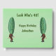 Este libro de personalizados para su fiesta o celebración es verde con dos hombres graciosos con trajes marrones con grandes pepinillos verdes para la cabeza que han sorprendido a sus caras. Personalizar tu información en el frente con la plantilla.